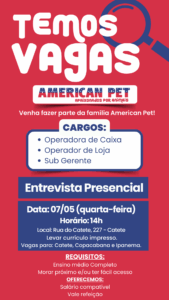A American Pet, maior rede de Pet Shop do Rio de Janeiro está com vagas abertas com entrevista agendada para HOJE – QUARTA-FEIRA. Veja as